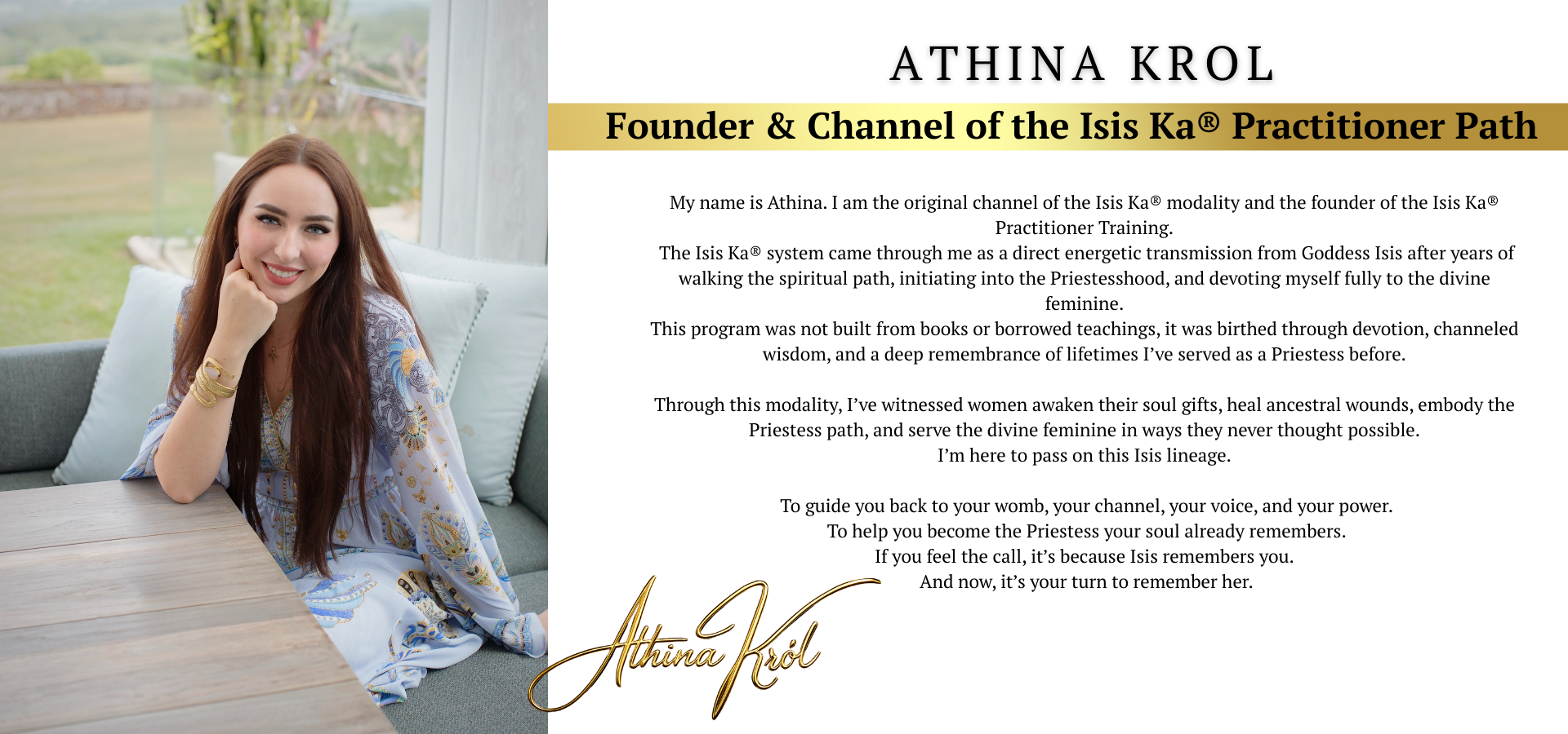 This program has been the best investment I have made in myself. I knew nothing about Goddess Isis before this but as soon as I read about the program, I knew deep down this was for me. I've since learned that Isis chose me for this role and this work is purposeful beyond my human understanding. Athina is a patient teacher and we have everything we need to learn this modality, embody it and create a business. My clients are getting amazing results with just the frequency transmission - pain that's been in their life for years is disappearing, they are more connected to spirit and have more clarity in their lives. It's such a gift to be a vessel for this work. Thank you Athina for channeling it during this time and space reality.